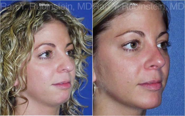 Before: 30 year old female bothered by her overly large nose in proportion to the rest of her face. This is due to droopiness to her nasal tip with a dorsal hump and a weak chin.
