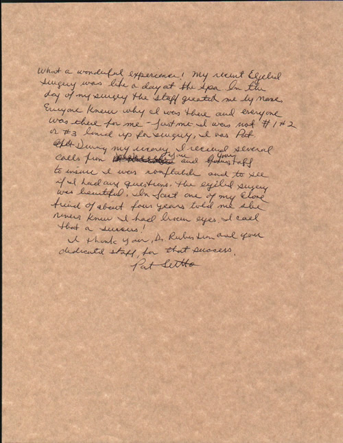 What a wonderful experience! My recent Eyelid surgery was like a day at the spa. In the day of my surgery, the staff greeted me by name. Everyone knew why I was there and everyone was there for me –just me-. I was not #1, #2 or #3 lined up for surgery, I was Pat. During my surgery I received several calls from you and your staff to ensure I was comfortable and to see if I had any question. The eyelid surgery was beautiful. In fact one of my clone friend of about four years told me she never knew I had green eyes. I call that a success.